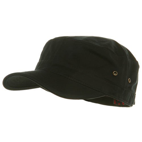 Add a bit of guerilla gear to your style for an urban chic result with this Trendy Military Cap. Made of thick smooth cotton, the roomy crown is constructed out of 3 panels of fabric to form a flat top, squared shape. The opening of the hat is banded with another strip of fabric with two ventilation holes on each side for added texture and shape. The inside of the hat is lined with a padded hatband for comfortable extended wear. Completing the look with a sharp curved bill measuring 2-1/2 inches long, this cap is full of attitude potential that can easily be realized with a tip of the hat or the whim to wear it mischievously askew. Made of 100% cotton. ONE SIZE fits most with brass buckle adjustment, fitting up to XL. Crown measures 3 inches deep, 3 panels, unconstructed. Bill measures 2-1/2 inches long, pre curved. Thick and soft material. Hand wash only. Available in black and forest. Imported